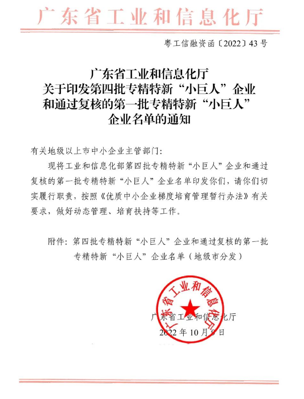 ? ? ? ?2022年10月9日,廣東省工業(yè)和信息化廳發(fā)布文件,公布了廣東省獲得國家級第四批專精特新“小巨人”企業(yè)的名單。我司憑借領(lǐng)先的技術(shù)實(shí)力、持續(xù)的創(chuàng)新能力、巨大的市場發(fā)展?jié)摿Γ约霸谛袠I(yè)內(nèi)取得的優(yōu)異成績,成功獲評國家級專精特新“小巨人”企業(yè)的榮譽(yù)。